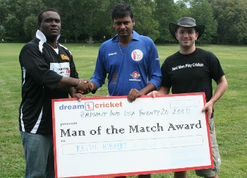 Image - Keith Hibbert (left) accepts a Man of the Match Award from former Indian Test player Debasis Mohanty (center) and journalist Peter Della Penna (right). [Copyright: DreamCricket.com]